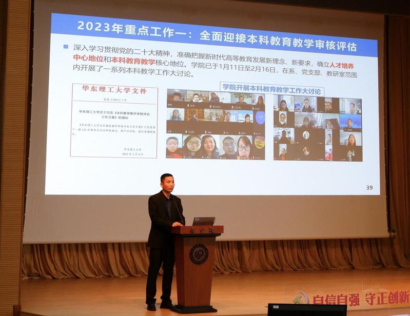 澳门十大信誉网赌大全副院长(主持工作)赵玉政教授代表学院行政班子做了澳门十大信誉网赌大全2022年度行政工作报告,报告从师资队伍、人才培养、学科建设、科学研究、国际交流与合作等方面,全面回顾了2020年以来澳门十大信誉网赌大全取得的突出成绩,着重分析了学院目前面临的机遇和挑战,并对2023年重点工作任务作了部署。在2023年的工作中,澳门十大信誉网赌大全将以本科教育教学审核评估,奉贤校区生物医药大楼、实验动物中心和现代产业学院建设为契机,持续推进学科建设、加强师资队伍建设、提高人才培养质量、优化实验室布局、提升产教融合能力、促进国际交流合作,推动学院事业发展再上新台阶。