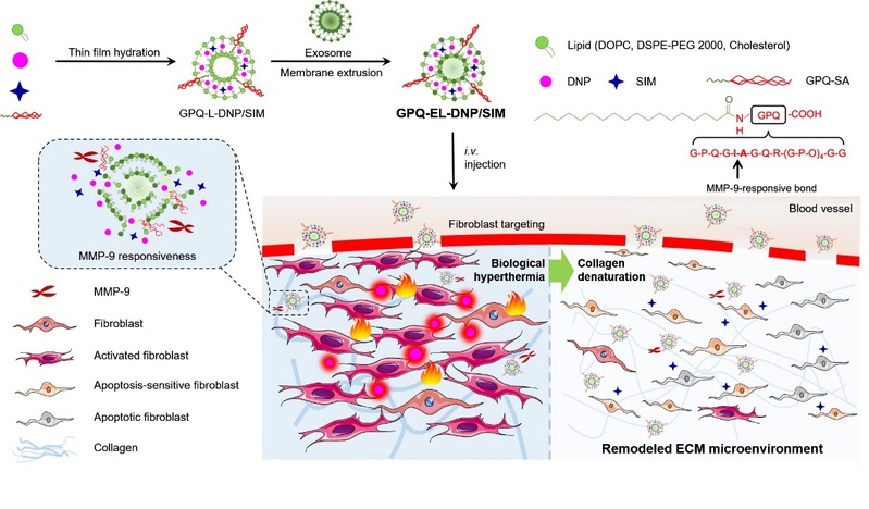 基于纤维化病灶中增强的通透保留效应,和DNP的生物热疗特性,本研究设计构建GPQ-EL-DNP系统,具备外泌体的同源靶向特性和脂质体的载药能力,并具有减少非纤维化组织中的积累,延长循环时间以及增加肺纤维化组织的积累和渗透的优点。此外,基质金属蛋白酶(MMP)-9是一种主要由活化的成纤维细胞和巨噬细胞分泌的物质,参与ECM内纤维化的病理进展。GPQ是一种具有MMP-9裂解键的三螺旋肽,其修饰的递药系统具有MMP-9响应性脂质双层破坏和药物释放特性。因此,该系统优先靶向纤维化病灶,并通过MMP-9触发破坏脂质双分子层,释放出DNP。随后,DNP通过生物热疗使胶原变性,重塑ECM微环境,从而降低基质硬度,提高SIM对纤维化的治疗效果。