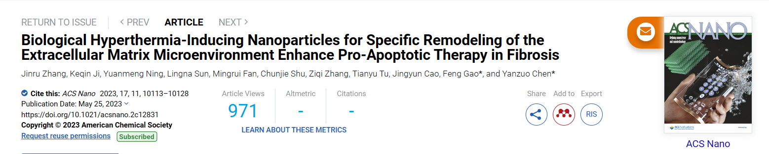 相关研究成果以“Biological Hyperthermia-Inducing Nanoparticles for Specific Remodeling of the Extracellular Matrix Microenvironment Enhance Pro-Apoptotic Therapy in Fibrosis”为题,在线发表于国际权威期刊《ACS Nano》上。2020级硕士研究生张金汝和季珂钦为共同第一作者,高峰教授和陈彦佐教授为通讯作者。该研究的成功实施,主要依托于上海市细胞代谢光遗传学技术前沿科学研究基地的支持和国家自然科学基金、上海市自然科学基金等项目的资助。