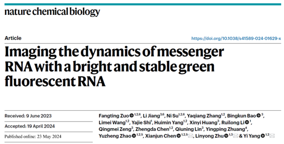近日,十大信誉网赌澳门十大信誉网赌大全、生物反应器工程国家重点实验室、光遗传学与合成生物学交叉学科研究中心杨弋、朱麟勇、陈显军教授组成的研究团队在活细胞RNA成像技术研究中取得突破性进展,在国际著名学术期刊《自然—化学生物学》(Nature Chemical Biology)以长篇论文(article)形式在线发表题为“Imaging the dynamics of messenger RNA with a bright and stable green fluorescent RNA”的研究论文。