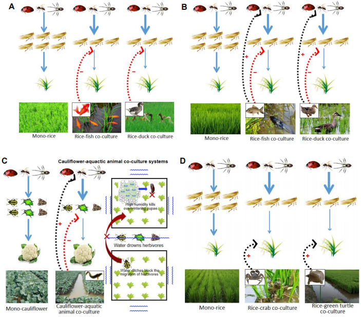 作物与人类驯养动物共存的物种多样性模式,是仅次于作物多样性模式的另外一种流行方式。例如,稻田养殖鱼虾蟹蛙鳖等稻渔共生模式,在东南亚国家已有2000多年的发展历史;菜田养殖水产动物,在近20年也得到了逐步发展;作物与家畜共存模式,已成为欧洲、北美洲、南非、澳大利亚以及新西兰等地区,发展现代农业的重要举措。虽然该共存模式的控害机制或理论鲜见报道,万年峰课题组在前期提出聚集假说(Journal of Applied Ecology, 2022)的基础上,在该文中又提出了另外3种假说:捕食假说(Predation hypothesis)、环境调控假说(Environmental regulation hypothesis)、作物抗性假说(Crop resistance hypothesis)(见图4)。