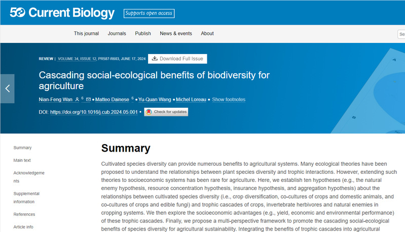 近日,澳门十大信誉网赌大全万年峰课题组在Cell子刊—Current Biology上发表了题为Cascading social-ecological benefits of biodiversity for agriculture的原创性成果,该论文被遴选为Featured content。
