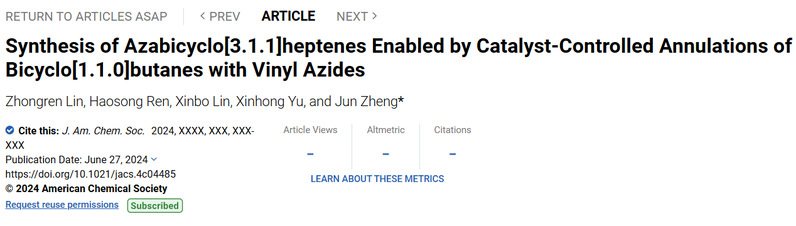 近日,十大信誉网赌澳门十大信誉网赌大全郑军课题组在国际权威学术期刊Journal of the American Chemical Society上发表题为“Synthesis of Azabicyclo[3.1.1]heptenes Enabled by Catalyst-Controlled Annulations of Bicyclo[1.1.0]butanes with Vinyl Azides”的研究论文,报道了课题组在催化剂调控双环[1.1.0]丁烷与α-烯基叠氮化物环化反应合成双环[3.1.1]庚烯的最新进展。