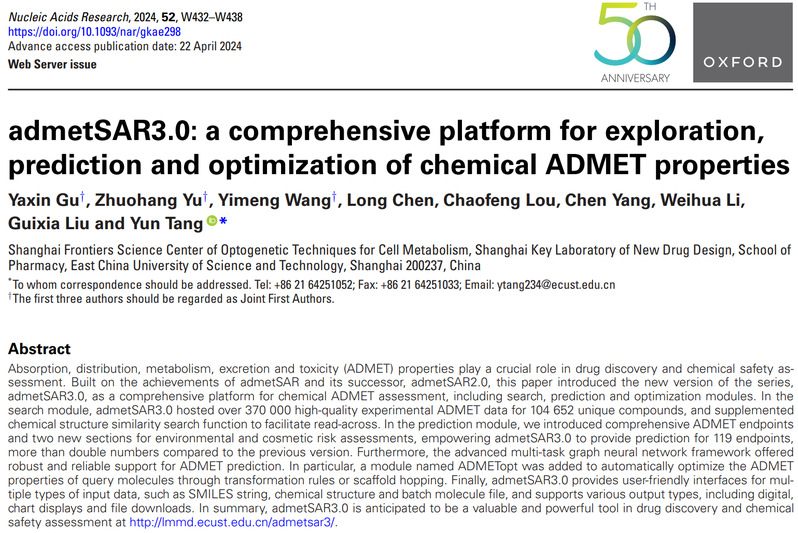 近日,十大信誉网赌澳门十大信誉网赌大全唐赟教授课题组发布了全面升级的化合物ADMET性质综合评估平台admetSAR3.0,该平台能够为化合物ADMET数据搜索、性质预测和优化提供一站式服务,用户可通过如下链接免费使用该平台:http://lmmd.ecust.edu.cn/admetsar3/。相关研究成果以“admetSAR3.0: a comprehensive platform for exploration, prediction and optimization of chemical ADMET properties”为题,发表于国际著名期刊《核酸研究》(Nucleic Acids ResearchIF=16.6)。