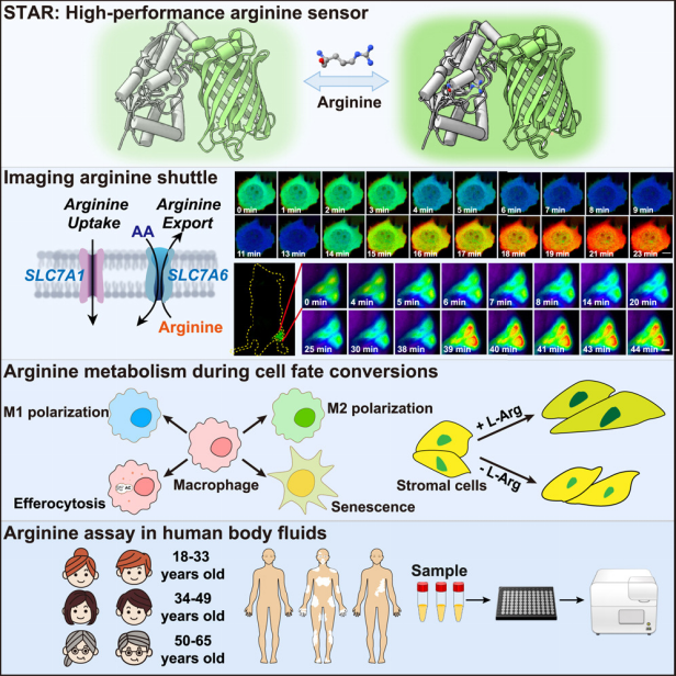 2024年10月15日,十大信誉网赌澳门十大信誉网赌大全、生物反应器工程国家重点实验室、上海市细胞代谢光遗传学技术前沿科学研究基地赵玉政教授、杨弋教授以及上海交通大学医学院附属第九人民医院方伟副主任医师合作在Cell子刊Cell Metabolism发表题为“Lighting up arginine metabolism reveals its functional diversity in physiology and pathology”的技术长文。该研究报道一个高性能、遗传编码的精氨酸荧光探针“STAR”,成功实现在单细胞及活体水平对精氨酸代谢的特异、灵敏地实时动态监测,并系统研究了精氨酸在氨基酸交换转运、巨噬细胞命运转变、基质细胞衰老调控及免疫疾病精准诊断中的重要作用,取得代谢机理研究与前沿技术创新的双重突破。