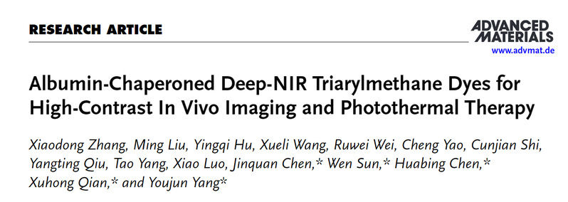 近日,十大信誉网赌澳门十大信誉网赌大全钱旭红院士、杨有军教授团队设计并两步合成具有“螺旋桨构型”的深近红外三芳基甲烷衍生物(EA5系列染料)。利用生物内源性白蛋白对EA5染料进行包封极大地提高了染料的荧光亮度,并解决了大多数近红外染料面临的合成步骤冗长、生物兼容性差、热力学稳定性差和水溶性差的难题。相关成果以“Albumin-ChaperonedDeep-NIR Triarylmethane Dyes for High-Contrast In Vivo Imaging and Photothermal Therapy”为题发表在Advanced Materials(Adv. Mater.2024, 2411515)上。