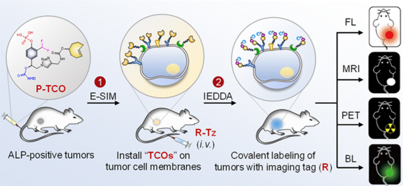 此外,谢贺新教授课题组与南京大学叶德举教授团队、江苏省原子医学研究所林建国研究员团队合作,在预靶向多模态活体动物肿瘤成像取得最新进展,相关成果以“Pretargeted Multimodal Tumor Imaging by Enzymatic Self-Immobilization Labeling and Bioorthogonal Reaction”为题发表在Journal of the American Chemical Society。该研究以研究团队前期发展的碱性磷酸酶自锚定探针(Chem. Eur. J. 2019, 25, 13994)为预靶向基团,通过亚甲基苯醌中间体的形成将反式环辛烯(TCO)选择性共价标记在活体动物肿瘤细胞膜上,进而通过快速的生物正交反应,将含有四嗪的各种信号报告基团(如荧光染料、磁纳米粒子、放射性核素、生物发光蛋白等)选择性富集在肿瘤细胞中,从而实现对活体小鼠肿瘤的高灵敏荧光、核磁共振、正电子发射断层及生物发光等多模态成像。南京大学博士研究生缪银杏、副研究员王宇琦、澳门信誉最好十大平台博士研究生陈叶锋为论文共同第一作者,谢贺新、林建国和叶德举为论文共同通讯作者。