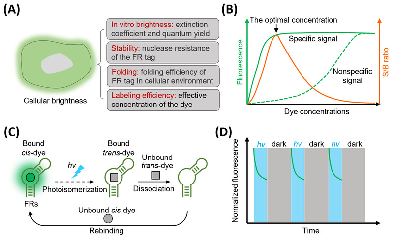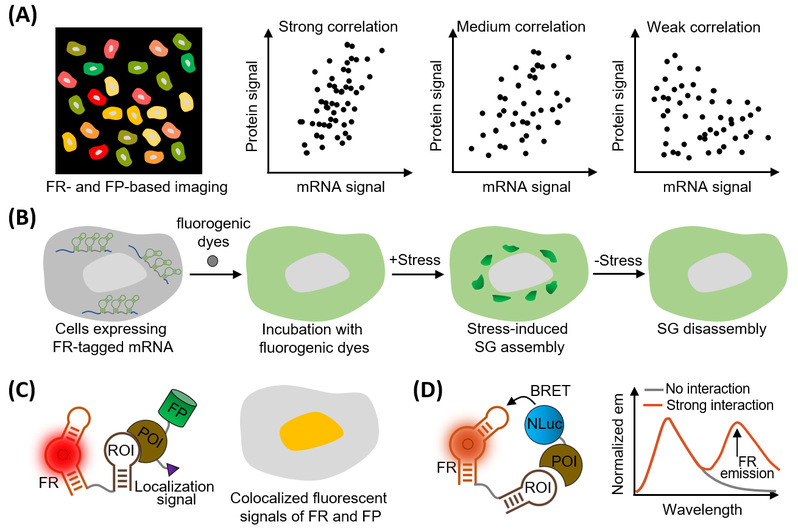 文章首先总结了荧光RNA在推动RNA动态研究方向的最新突破。Spinach、Pepper、Clivia等荧光RNA标签可被融合在小非编码RNA的5’、3’或者内部茎环位置实现对5S、U6、7SK、U1等小非编码RNA的原位标记与动态成像。此外,研究人员通过串联、并联或者串并联方式将多个荧光RNA标签进行融合,获得的多拷贝串联体具有显著增强的荧光信号,进而实现低丰度mRNA的高信噪比甚至是单分子成像。此外,Pepper、Okra、RhoBAST、Clivia等荧光RNA凭借其优异的荧光亮度和光稳定性,被用于活细胞RNA的SIM、STED等超分辨率成像,揭示了RNA在RNA颗粒内的非均一分布特性。研究人员还利用荧光RNA实现活细胞RNA-蛋白质相互作用的实时检测,在降低背景干扰的同时可显著提升检测灵敏度。进一步地,荧光RNA技术还可衍生出一类通过序列杂交激活的荧光RNA探针,它们无需对基因组进行改造便可实现对细胞内源RNA分子的标记成像。