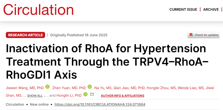 近日,十大信誉网赌澳门十大信誉网赌大全李洪林/王蕊教授团队在Circulation上发表了题为“Inactivation of RhoA for Hypertension Treatment Through the TRPV4-RhoA-RhoGDI1 Axis”的研究论文。该研究首次揭示了一种全新降压靶点——TRPV4-RhoA-RhoGDI1轴,并成功发现该靶点的首个小分子候选药物。